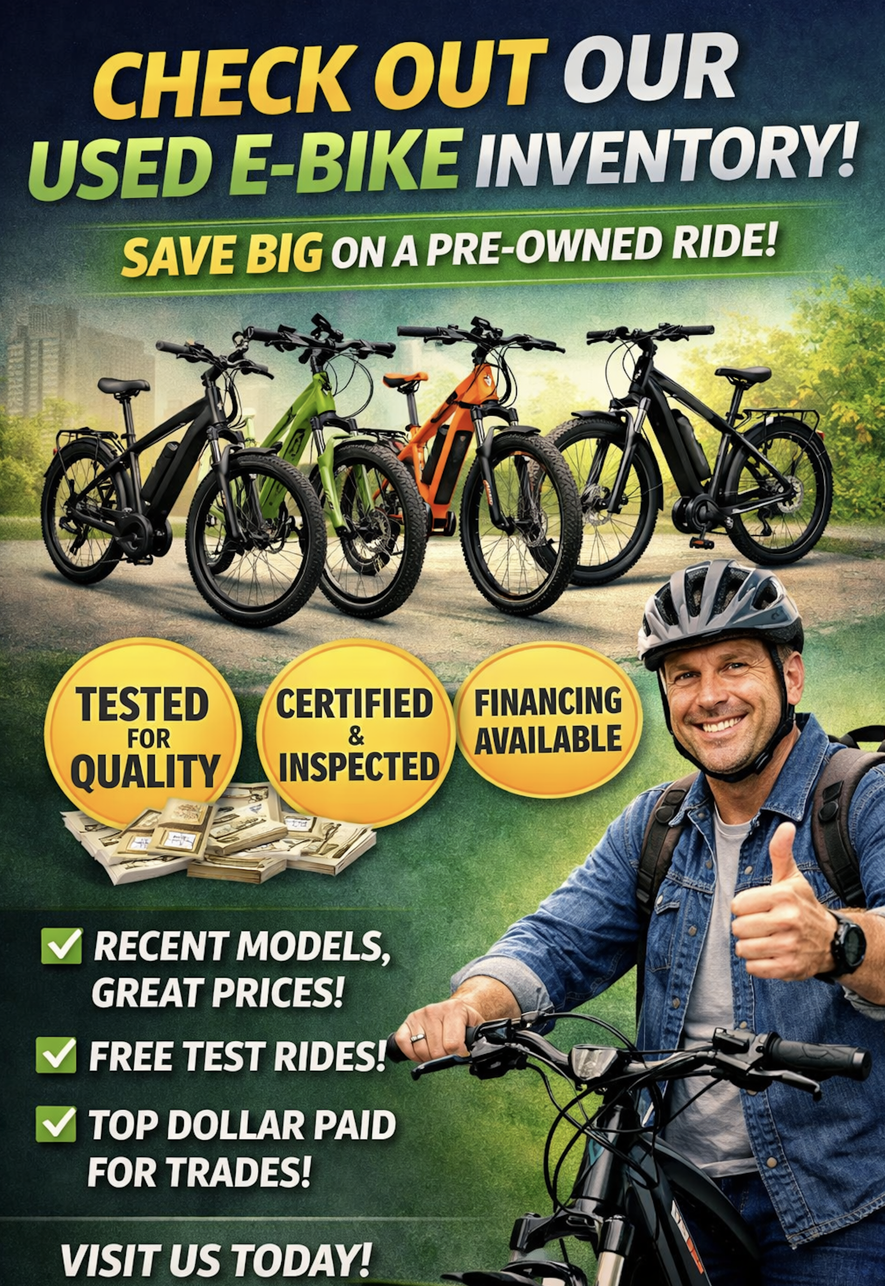 Looking for an e-bike without the brand-new price tag? Check out our used inventory—professionally inspected, tuned, and ready to roll.